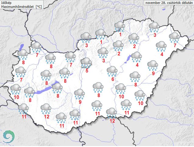 Délutántól észak, északnyugat felől csaknem országszerte várható időszakos eső. Délelőtt a déli szél helyenként megélénkül, majd délután északnyugatira fordul és több helyen lesz élénk, főként Sopron környékén előfordulhatnak erős széllökések is.