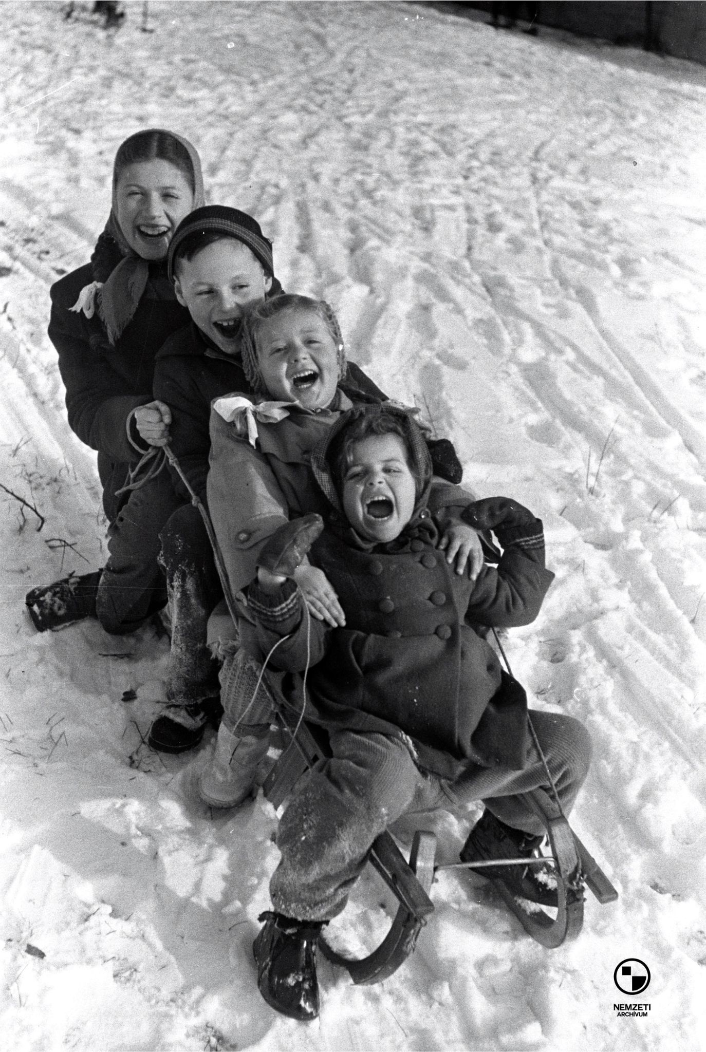 Szánkózó gyerekek Leányfalun 1956 januárjában (Fotó: Nemzeti Archívum)