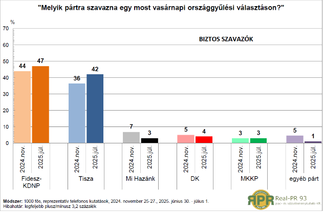 Még nagyobb kormánypárti előnyt mért július elején a Magyar Társadalomkutató, akik 8 százalékpontos előnyt vizionál a Fidesz–KNDP-nek a Tisza Párttal szemben, az aktív szavazó pártválasztók körében. A felmérésük szerint ha a választásokat most, 2025 első júliusi vasárnapján tartották volna, csak ez a két párt lépte volna át az 5 százalékos parlamenti bejutási küszöböt.