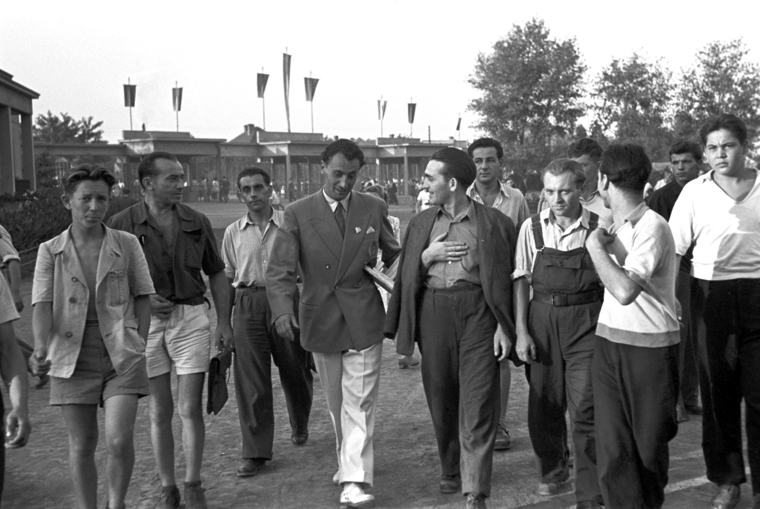 Budapest, 1952. augusztus 13. A Rákosi Mátyás Művek dolgozói beszélgetnek Benedek Gábor olimpiai öttusázóval (b4) az olimpikonok helsinki olimpiával kapcsolatos élményeikről tartott beszámolóján a Rákosi Mátyás Művek csepeli sportstadionjában. (Fotó: MTI Fotó/Magyar Fotó/Bojár Sándor)– Milyen munkát vállalt ebben az időszakban?