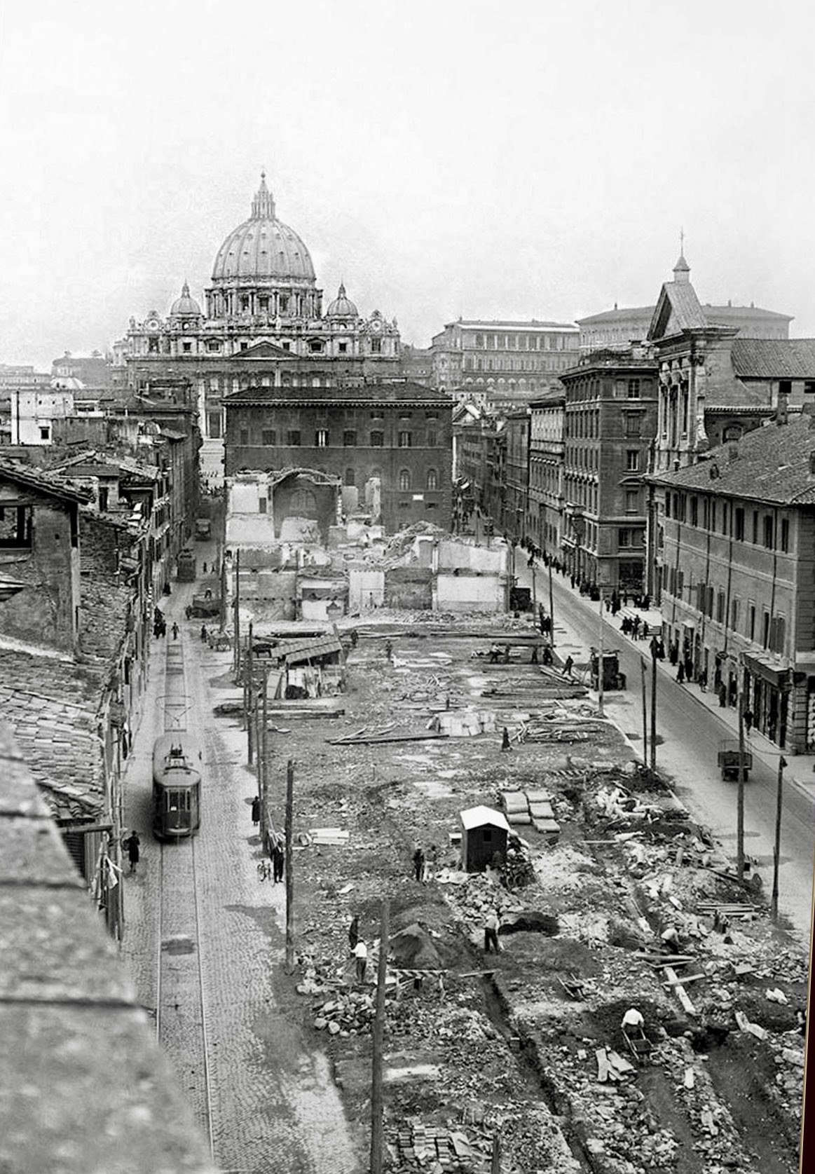 Az előző kép részleteA helyzet az 1930-as években változott meg, miután az olasz állam és a Vatikán rendezték kapcsolatukat, kialakult a pápai állam ma ismert területe. Ekkor már zajlottak Mussolini nagy római átalakítási projektjei, melyek során főként az ókori város értékeit kívánták bemutatni – a későbbi (és feljebb lévő) rétegeket szó szerint elsöpörve. Így jött létre a Via dei Fori Imperiali a Colosseum és a Piazza Venezia között, és ebbe a koncepcióba illeszkedett a régóta dédelgetett sugárút megvalósítása is: