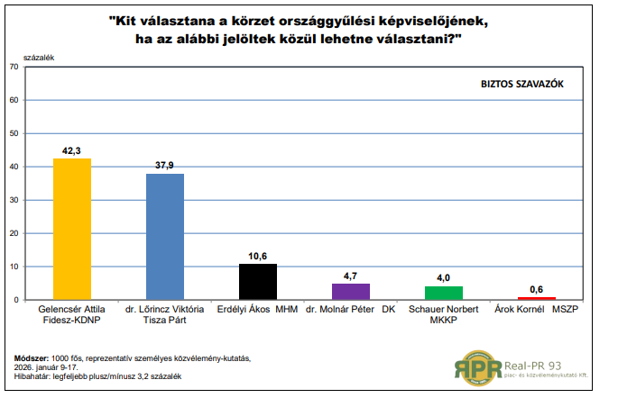 Mint írták, a Real-PR 93 2026. január közepén ezerfős, személyes kérdezésen alapuló felmérést készített Somogy vármegye 1-es választókerületében, amelynek Kaposvár a székhelye. „A választókerületi felmérés eredménye visszaigazolta az országos trendeket. A Real-PR 93 múlt év decemberi országos kutatása a biztos szavazók bázisán 11 százalékpontos Fidesz-előnyt azonosított, amely a 2022-esnél 5 százalékponttal kevesebb. Ugyan a Fidesz 2026-os választási győzelme a kutatás alapján nagyon valószínű, négy évvel ezelőtti országos előnyének közel harmadát elvesztette a kormánypárt új kihívójával szemben” – fogalmaztak a kutatás összefoglalójában.