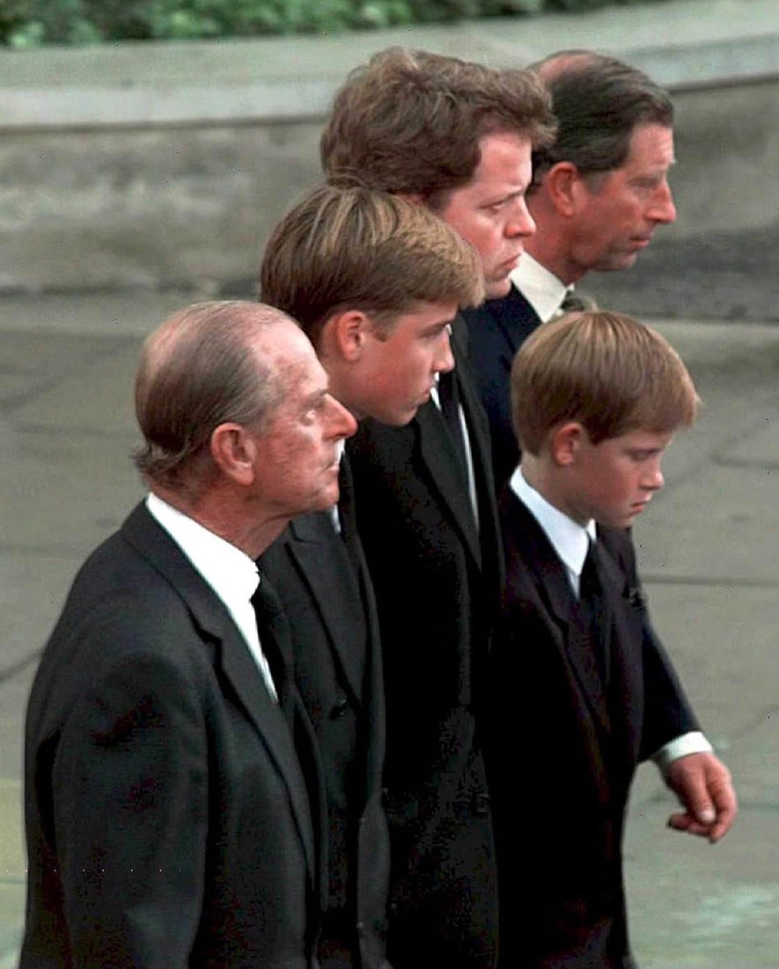 FÜLÖP, Edinburgh hercege, VILMOS herceg, DIANA hercegnő idősebb fia, Earl SPENCER, Diana bátyja, KÁROLY, walesi herceg, brit trónörökös és HENRIK herceg, Diana kisebb fia gyalog követi az 1997. augusztus 31-én elhunyt Diana hercegnő koporsóját a Westminster apátságba, szeptember 6-án.(MTI FOTO/EPA)