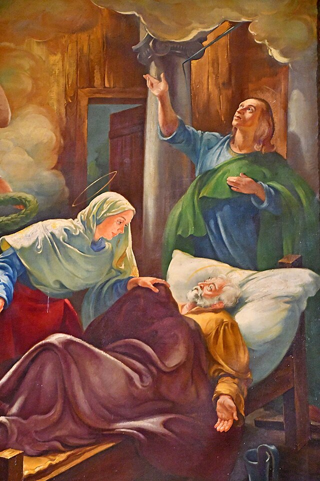 Szent József-oltár a budapesti Szent István első vértanú templomban (Forrás: Wikipédia)Lukács evangélistától tudjuk: „Történt pedig azokban a napokban, hogy Augustus császár rendeletet adott ki: írják össze az egész földet. Ez az első összeírás akkor történt, amikor Szíriában Cirénius volt a helytartó. Elment tehát mindenki a maga városába, hogy összeírják. Felment József is a galileai Názáretből Júdeába, a Dávid városába, amelyet Betlehemnek neveznek, mert Dávid házából és nemzetségéből való volt, hogy összeírják jegyesével, Máriával együtt, aki áldott állapotban volt. És történt, hogy amíg ott voltak, eljött szülésének ideje, és megszülte elsőszülött fiát” (Lukács 2,1-7).