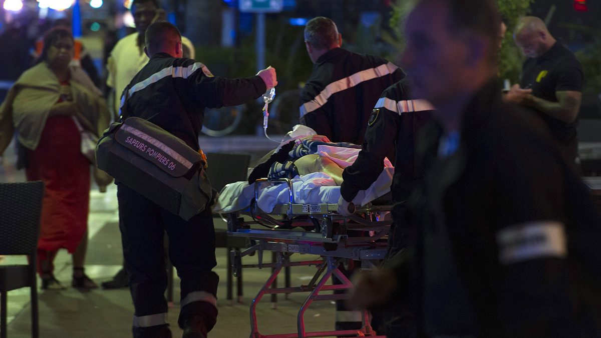 Sebesültet visznek kórházba a Nizzában történt terrorcselekmény helyszínéről (Fotó. MTI/EPA/Olivier Anrigo)