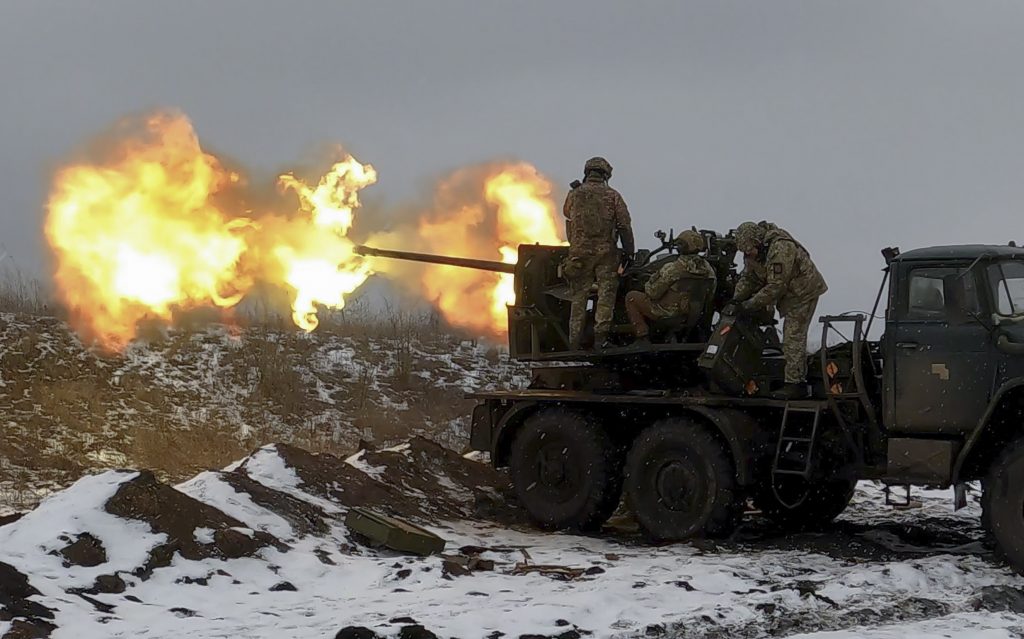Ukrán katonák légvédelmi ágyúval tüzelnek egy állásnál a kelet-ukrajnai Donyecki területen lévő Bakhmut közelében, 2023. február 04-én. Fotó: EPA/SERGEY SHESTAKNagyszabású offenzíva készül az orosz haderő, közeledve a konfliktus kitörésének február 24-i évfordulójához.