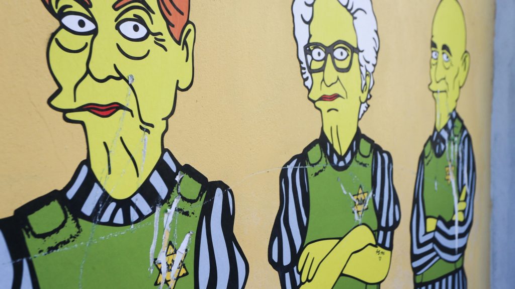 Az alakok között Ferenc pápa is látható kereszttel a kezében és egy táblával, amelyen az „antiszemitizmus mindenhol jelen van” felirat olvasható.