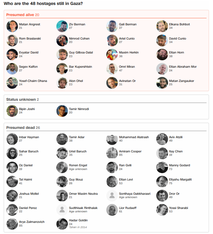 Az átadásra kerülő túszok fényképes névsora, a 2023. október 7-i elrablás idején betöltött életkorukkal együtt feltüntetve. A 48 túszból 20-an vannak életben, 26-an meghaltak, két ember sorsa pedig ismeretlen (Fotó: CNN)Az orvosok és pszichológusok egyaránt hangsúlyozzák, hogy a mentális gyógyulás hosszadalmas folyamat lesz. A visszatért túszoknak „újra emberré kell válniuk”, megtanulva, hogyan gyakorolhatnak autonómiát saját életük felett, miután éveken át kiszolgáltatott állapotban voltak.