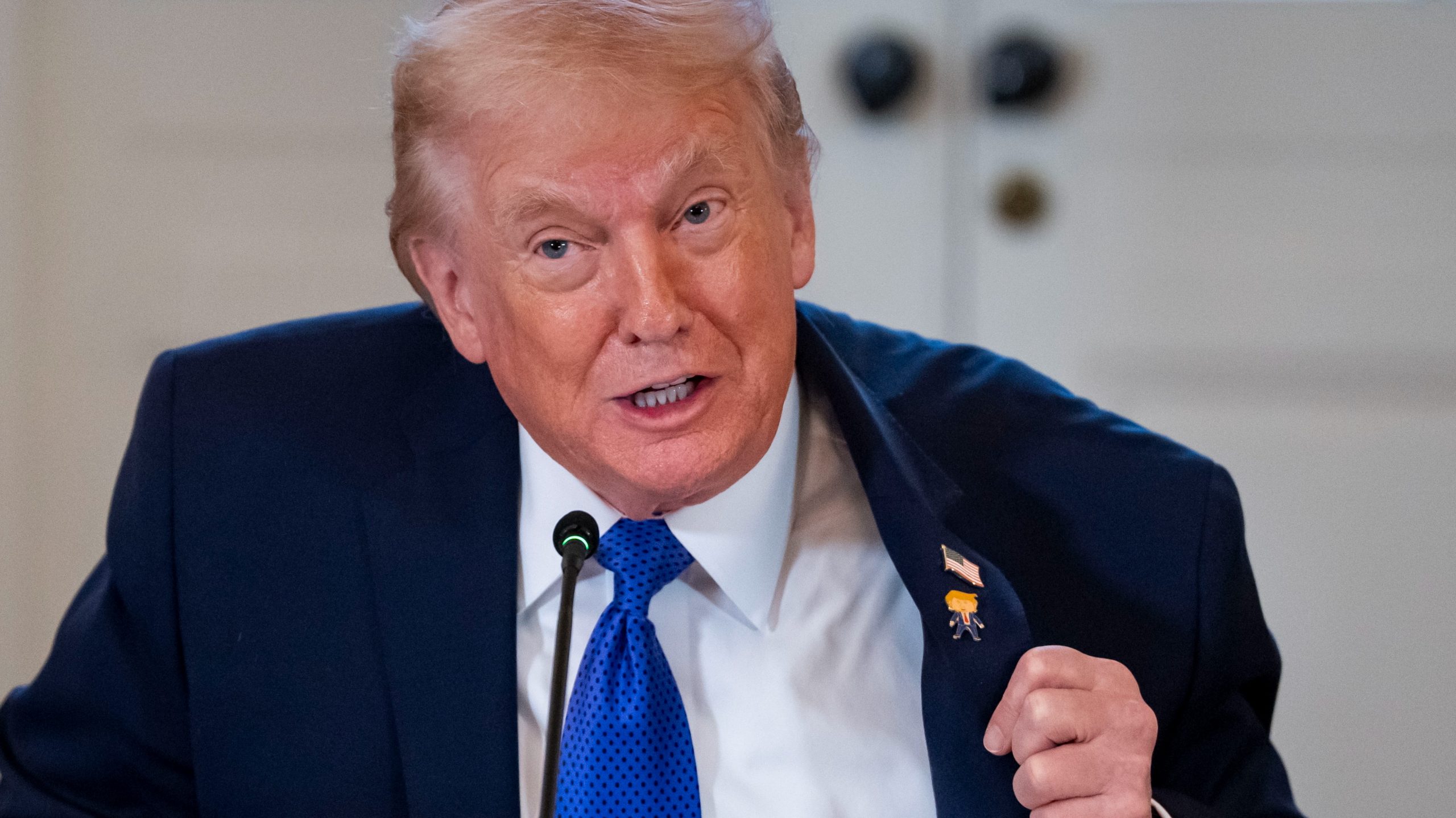 Donald Trump amerikai elnök a Boldog Trump nevű kitűzőjét mutatja a legnagyobb amerikai energiaipari vállalatok vezetőivel rendezett tanácskozáson a washingtoni Fehér Ház Keleti termében 2026. január 9-én (Fotó: MTI/EPA/UPI pool/Bonnie Cash)Úsznak a hitelkártya-adósságban