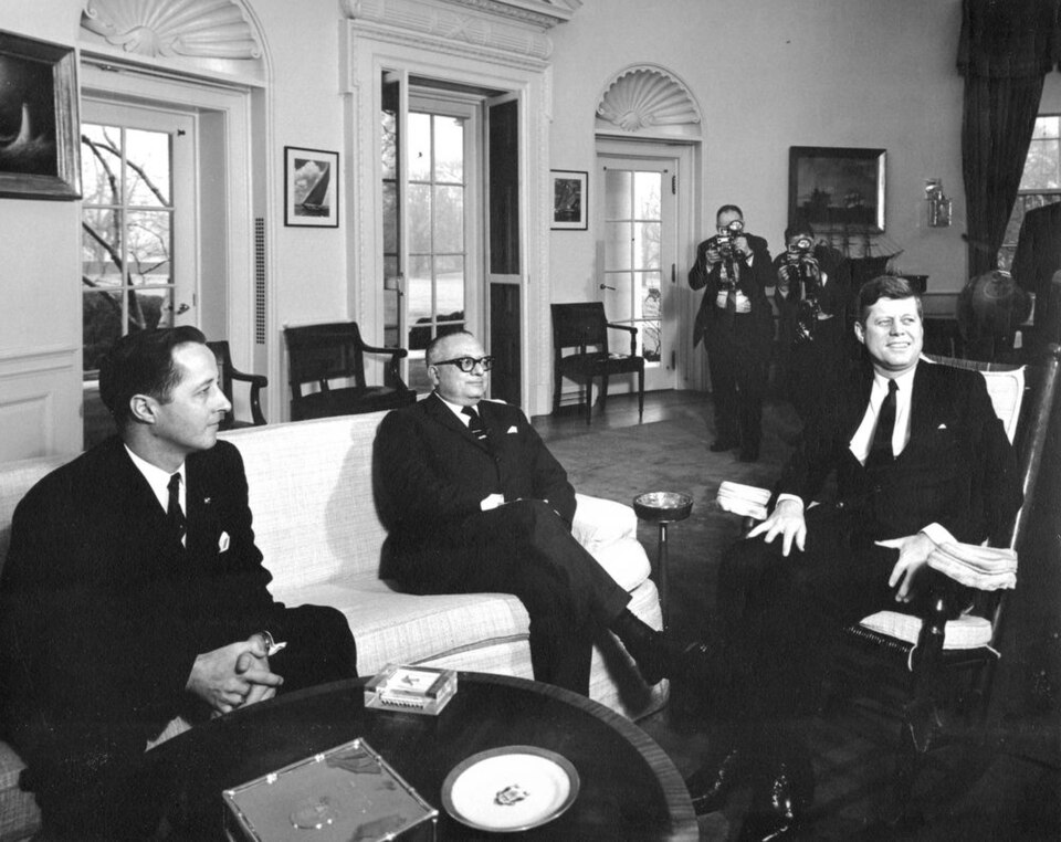 Rómulo Betancourt venezuelai elnök (k) látogatása idején amerikai kollégájánál, John Fitzgerald Kennedy elnöknél (j), 1963. február 19-én (Fotó: Wikipédia)A kétoldalú kapcsolatok 1963-ra érték el tetőpontjukat, amikor John F. Kennedy elnök (akit ugyanebben az évben meggyilkoltak) hivatalos látogatás keretében fogadta Rómulo Betancourt elnököt Washingtonban, alig négy hónappal az 1962-es kubai rakétaválság rendezése után. Az amerikai–venezuelai egyezség Kennedy után is kitartott, a kapcsolatok folyamatosan javultak az ötletgazda, Nixon vagy a 80-as években, Ronald Reagan elnöksége idején is.