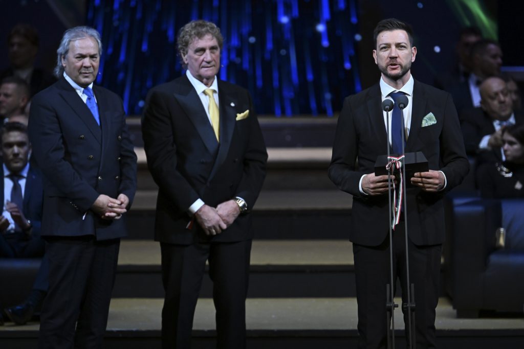Papp Dániel, a Médiaszolgáltatás-támogató és Vagyonkezelõ Alap (MTVA) vezérigazgatója (j) a 68. Nemzeti Sport Gálán a Magyar Állami Operaházban 2026. január 12-én. Mellette Rabah Madzser, az algériai labdarúgó-válogatott és az FC Porto korábbi játékosa (b) és Jean-Marie Pfaff, a belga labdarúgó-válogatott és a Bayern München korábbi kapusa.